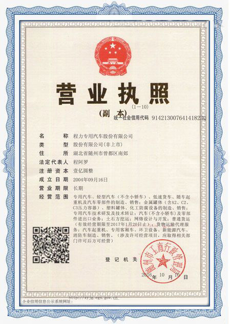 程力专用汽车股份有限公司销售二十六分公司各类专用汽车的专业厂家,大型专用汽车厂。国内园林绿化、石油化工、市政环卫、压力容器专用汽车商。注册“程力威”牌,产品代码:“CLW”。东风、解放、福田、重汽、陕汽、北奔等公司的重要合作伙伴,主要从事各类专用汽车的业务,同时也销售各大型厂家的整车及配件。公司拥有自行出口权,其主导品种有洒水车系列、吸污(吸粪)车系列、垃圾车系列、扫地车系列、油罐加(运)油车系列、高空作业车系列、清障车系列、随车吊系列、自卸车系列、教练车系列、半挂车系列、化工车系列、消防车系列、厢式(冷藏车)系列、牵引车系列、粉粒物料车系列、搅拌车系列、压力容器系列、专用车配件等十八大系列300多个品种车型。同时批发东风、解放、楚风各种二类底盘。